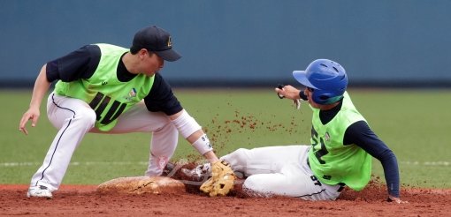 경남 창원시를 연고로 한 프로야구 제9구단인 '엔씨소프트 다이노스'의 1차 트라이아웃(사전 테스트)이 29일 마산야구장에서 전날에 이어 열렸다. A팀 52번 이강현이 도루에 성공하고 있다.