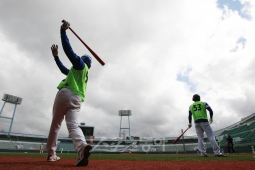 경남 창원시를 연고로 한 프로야구 제9구단인 '엔씨소프트 다이노스'의 1차 트라이아웃(사전 테스트)이 29일 마산야구장에서 전날에 이어 열렸다. 이날 오후부터 열린 홍백평가전 중 비가 내렸다. 7회에 햇빛이 나면서 마산구장 하늘에 구름이 잔뜩 끼어있다.