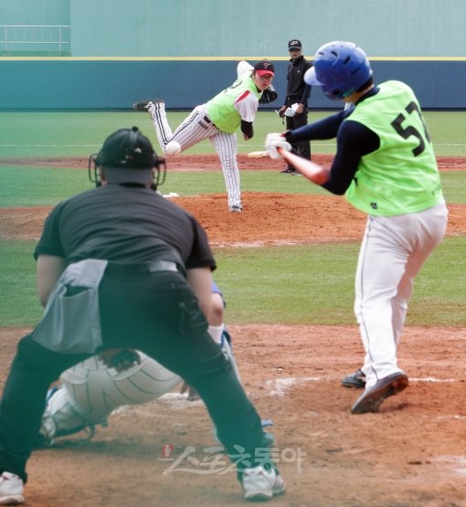 경남 창원시를 연고로 한 프로야구 제9구단인 '엔씨소프트 다이노스'의 1차 트라이아웃(사전 테스트)이 29일 마산야구장에서 전날에 이어 열렸다. 이날 오후에 열린 홍백평가전에서 참가 선수들이 열띤 경기를 펼치고 있다.