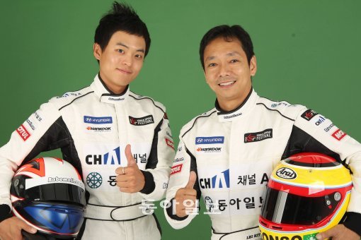 2일부터 강원 태백시의 태백레이싱파크에서 열리는 2011 코리아스피드페스티벌에 참가하는 ‘채널 A 동아일보 레이싱 팀’의 드라이버인 조성민 선수(왼쪽)와 레이킷 멍 선수가 엄지손가락을 치켜세우며 선전을 다짐하고 있다. 변영욱 동아일보기자 cut@donga.com