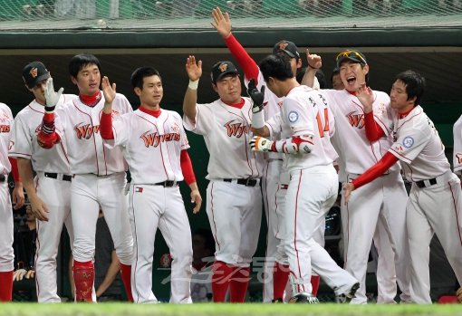 SK는 쉽게 무너지지 않는다. SK는 30일 한화전에서 0-5까지 뒤졌으나 최정의 동점홈런으로 5회 5-5 동점을 만드는 저력을 서놉였다. 최정(14번)의 홈런 뒤 선수들이 환호하고 있다. 문학 | 김종원기자 won@donga.com 트위터 @beanjjun