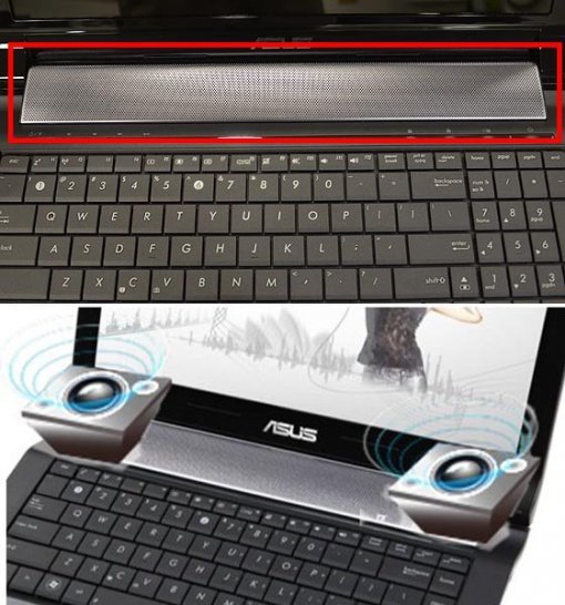 아수스 N53SV에는 뱅앤올룹슨의‘아이스파워’ 디지털 앰프와 아수스의‘소닉마스터’ 사운드 솔루션이 내장되었고, 앰프 출력은 3W(일반 노트북은 2W), 스피커(유닛) 크기는 25mm(일반 노트북은 약 20mm 이하), 사운드 울림통(챔버, chamber)은 일반 노트북의 2배인 40cc다. 이 정도면 거의 데스크탑용 스피커라 해도 무리 없을 수준이다. 실제로 N53SV는 키보드 상단에 있는 약 30cm 길이의 바 형태의 스피커를 제공하고 있다. 내부가 어떻게 되어 있는지 열어 볼 순 없지만, 양쪽 끝으로 25mm 스피커 유닛이 배치되어 있으리라 짐작된다. 흡사 시중에서 판매되는 USB 외장 스피커를 따로 달아 놓은 형태다. 외형만 봐도 충분히 비범한 음질을 기대할 수 있을 만하다.