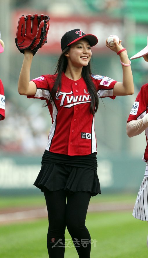1일 저녁 서울 잠실야구장에서 열린 LG와 두산의 프로야구 경기에서 연기자 김지원이 시구자로 나와 시구를 한 후 관중들에게 인사를 하고 있다.