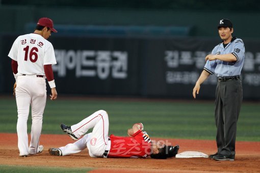 1일 서울 목동야구장에서 열린 프로야구 SK 와이번스와 넥센 히어로즈의 경기에서 5회초 무사 2루 상황에서 2루주자 박재홍이 넥센 김성태의 견제구에 슬라이딩한채 엎드려 있다.