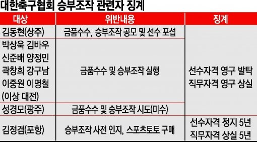 한편 승부조작 정보를 사전에 입수하고 스포츠토토를 구입한 혐의로 기소된 김정겸은 협회로부터 연맹과 같은 5년 선수 자격 정지와 직무 수행 정지 처분을 받았다.