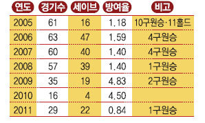 오승환의 올해 페이스는 한마디로 무시무시하다. 2년 연속 40세이브 고지를 밟았던 2006∼2007년을 연상시킨다. 속을 들여다보면 더 강력해졌음을 짐작할 수 있다. 적어도 지금까지는 말이다. 오승환의 시즌 방어율을 그래프로 만들면 올해가 가장 낮다. 2005년 1.18, 2006년 1.59, 2007년 1.40, 2008년 1.40이었다. 물론 2009년(4.83)과 2010년(4.50)은 참담했다.