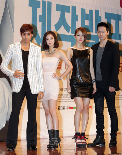 5일 오후 2시 서울 여의도 63시티에서 열린 KBS 새 월화드라마 ‘스파이 명월’ 제작발표회에 참석한 문정혁, 한예슬, 장희진, 이진욱(왼쪽부터)이 다정하게 포즈를 취하고 있다.