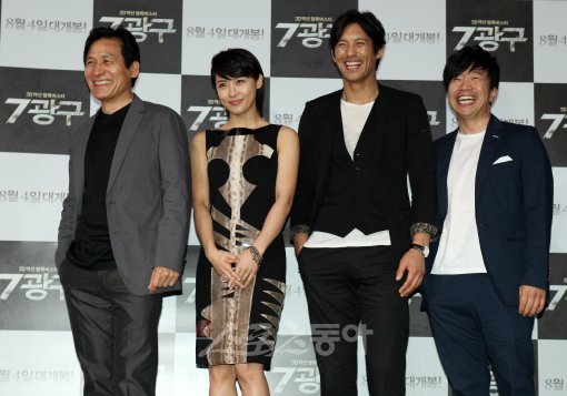 올해 여름 또 한 편의 블록버스터인 ‘7광구’의 주역들이 한 자리에 모였다. 안성기, 하지원, 오지호, 박철민(맨 왼쪽부터)이 7일 오전 서울 왕십리CGV에서 열린 ‘7광구’ 제작발표회에서 활짝 웃고 있다. 국경원 기자 (트위터 @k1isonecut) onecut@donga.com