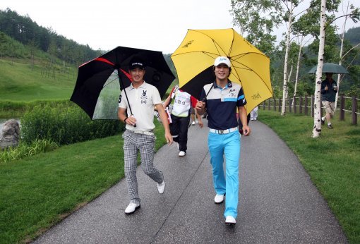 강원도 정선 하이원 골프장에서 열린 2011 더 채리티 하이원리조트오픈 이틀째인 8일 기상악화로 인한 경기 지연으로 1라운드 잔여경기를 치르고 있는 김형성과 김대현(왼쪽부터)이 우산을 쓴 채 14번홀 그린으로 이동하고 있다.사진제공|KGT
