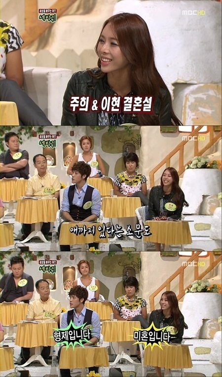 9일에 방송된 MBC ‘세상을 바꾸는 퀴즈(세바퀴)’에 출연한 이현과 주희는 두 사람의 결혼설에 대해 강하게 부인했다. 심지어 이들사이에 아이가 있다는 루머가 생기기도 했다고. 이에 대해 이현은 “우리는 형제다”라고 말했으며 주희 역시 “나는 아직 미혼이다”라고 밝혔다.