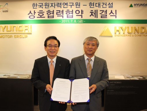 현대건설이 한국원자력연구원과 8일 서울 종로구 계동 현대건설 별관 8층 비젼홀에서 미래형 원전개발 사업 및 연구로 수출사업 등을 위한 상호협력협약 체결식(사진)을 가졌다. 정수현 현대건설 사장과 정연호 한국원자력연구원장이 참석한 가운데 진행된 체결식에서 양 기관은 공동연구, 인력교류, 연구시설 및 장비의 공동 활용, 학술 및 정보교류 등을 통해 우리나라 원자력 기술과 산업발전을 위해 협력하기로 합의했다.