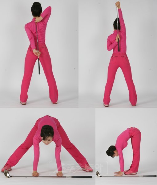1. 18홀 내내 어드레스 자세를 취할 때 상체를 숙이게 되므로 반대동작으로 가슴과 어깨를 확장시키고 자세를 바르게 한다.