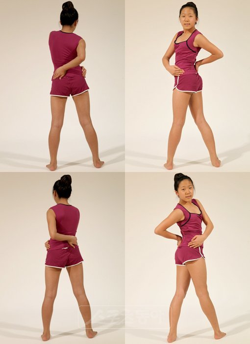1. 양 다리를 어깨넓이로 벌리고 오른손은 왼쪽 허리 뒤에, 왼손은 오른쪽 골반 옆에 놓는다.