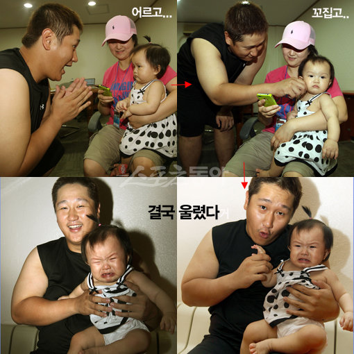 롯데 이대호는 15일 사직 LG전을 앞두고 딸처럼 아끼는 조카 효진이를 만났다. “지난번 3연타석 홈런 칠 때도 그렇고 효진이가 올 때 유독 성적이 좋았다. 대호가 요즘 하도 방망이가 안 맞는다고 해서 일부러 효진이를 데려왔다”는 게 형 이차호 씨의 설명. 이대호는 효진이가 자신의 품에만 안기면 유독 더 크게 울자 “자주 못보고 지금 막 낯을 가릴 때라서인지, 내게만 오면 운다”며 아쉬워했다.