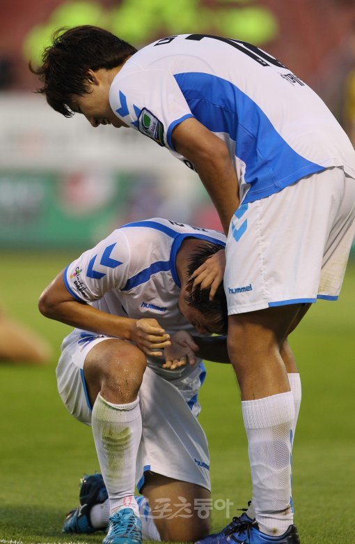 17일 전남 광양전용구장에서 열린 프로축구 2011 18라운드 전남드래곤즈와 대구FC 경기에서 대구FC 송제헌이 동점골을 넣은 후 김현성에게 축하를 받고 있다.