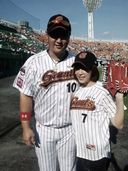 강예원은 야구모자에 한손에는 글러브를 끼고 롯데 이대호와 함께 다정하게 사진을 찍었다.