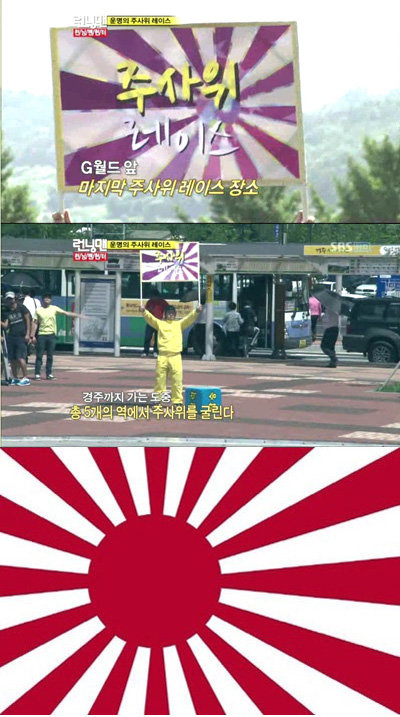 SBS '일요일이 좋다-런닝맨'에 욱일승천기를 연상시키는 깃발이 등장해 논란이 되고 있다.