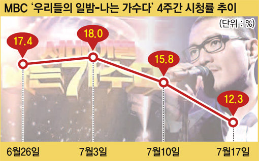 ‘나가수’는 시청률조사회사 AGB닐슨 미디어리서치의 시청률 조사에서 17일 방송분이 전국 기준 12.3%의 시청률을 기록했다. 이는 10일 방송이 기록한 15.8%보다 3.5% 포인트나 하락했다.