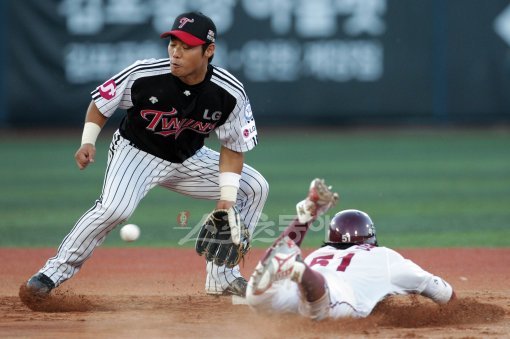 20일 서울 목동야구장에서 열린 ‘2011 롯데카드 프로야구’ 넥센과 LG의 경기에서 2회말 넥센 공격, 2사 1루 김민우 타석때 1루주자 장기영이 LG 2루수 김태완이 볼을 놓치며 도루에 성공하고 있다.