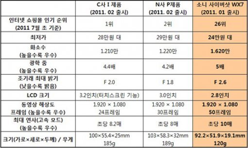 다만 그럼에도 사용자 후기가 70여개에 불과한 건 그만큼 알려지지 않았다는 뜻이다. 현재 일반 디카의 판매 순위, 더구나 20만원 대의 제품 사양을 들여다 보면, 전반적으로 WX7보다 나을 게 거의 없기에 더욱 그렇다. 실례로, 인기 순위 1위인 ‘C’사의 한 제품과 비교하면 WX7이 화소수와 줌 배율, 동영상 프레임 등은 높지만 크기, 무게도 훨씬 작고 가볍다. 아울러 3D 사진/파노라마도 찍을 수 있으면서 가격은 싸다(인터넷 쇼핑몰 최저가 기준). 아래 표는 1위 제품과 WX7의 주요 사양 및 기능의 비교다. 선택은 소비자의 몫이지만, 그전에 선택 기준에 대해 면밀하게 고민할 필요가 있음을 말하고 있다. 세상에는, 특히 디카 분야에는 생각보다 괜찮은 제품이 너무나 많다.