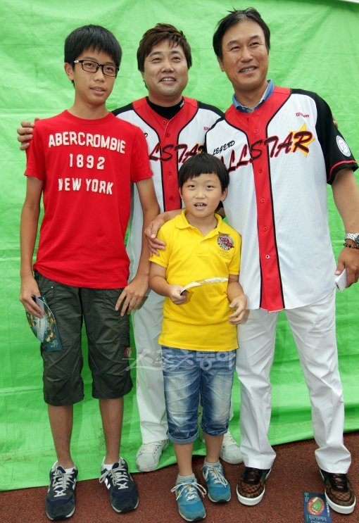 22일 오후 서울 잠실주경기장에서 열린 ‘프로야구 30주년 팬 페스티벌’의 일환으로 레전드 올스타 팬 사인회가 열렸다. 장종훈의 아들들이 양준혁과 기념촬영하고 있다.
