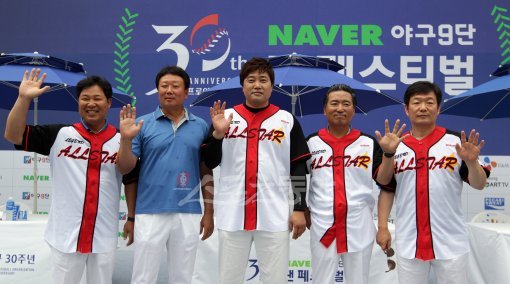 22일 오후 서울 잠실주경기장에서 열린 ‘프로야구 30주년 팬 페스티벌’의 일환으로 레전드 올스타 팬 사인회가 열렸다. 레전드 올스타 이만수, 선동열, 양준혁, 장효조, 이순철(왼쪽부터)이 사인회에 앞서 팬들에게 손을 흔들며 포즈를 취하고 있다.