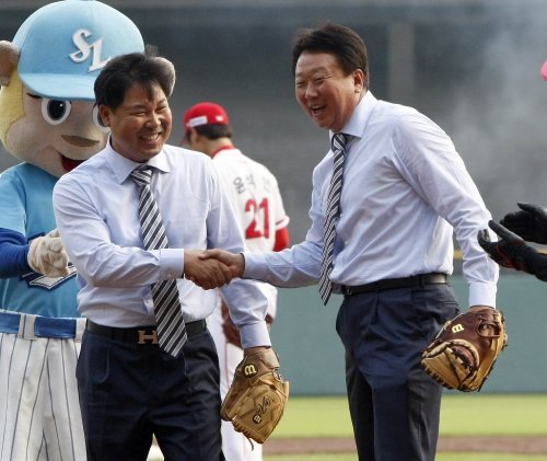 23일 잠실야구장에서 열린 2011 프로야구 올스타전 경기 전 프로야구 30년 레전드 올스타에 선정된 이만수코치와 선동열 전 감독이 시구와 시포를 마치고 악수를 나누고 있다.