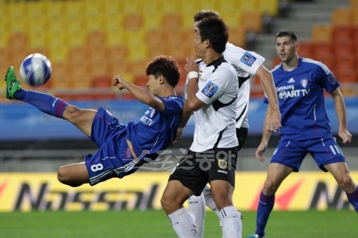 27일 오후 7시30분 수원월드컵경기장에서 ‘2011 하나은행 FA컵 8강전’ 수원과 전남의 경기에서 수원삼성 이상호가 문전에서 수비수를 피해 오버헤드킥을 시도하고 있다.