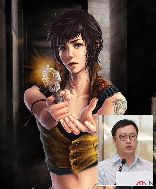 네오위즈게임즈 윤상규 대표가 글로벌 전략발표를 하고 있다. 중국에서 역대 최고 동시접속자 수를 기록한 ‘크로스파이어’의 캐릭터(왼쪽 큰 사진). 사진제공|네오위즈게임즈