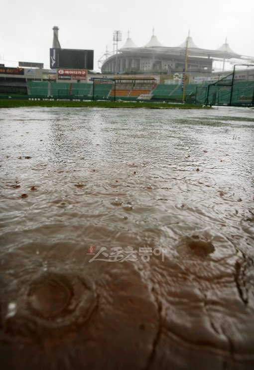 2일 인천 문학야구장에서 프로야구 LG트윈스와 SK와이번스의 경기 전에 소나기가 내리고 있다.