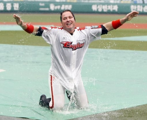 3일 대전 한밭야구장에서 열릴 2011 프로야구 한화이글스 대 롯데자이언츠 경기 전 많은 비가 내려 경기가 취소되자 한화 가르시아가 우천 세리머니를 하고 있다.