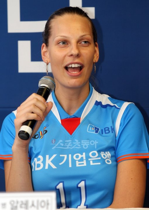 4일 오후 서울 중구 을지로2가 기업은행본점에서 IBK기업은행 여자배구단 '알토스' 창단식이 열렸다. 용병 알레시아가 한국무대에 진출한 소감을 밝히고 있다.