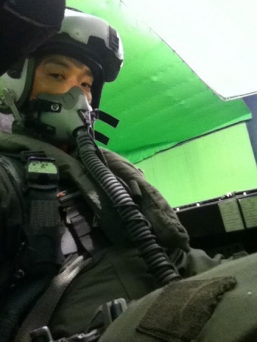 비는 4일 자신의 트위터에 "전 스탭들이 24시간 넘게 촬영중. 그래도 전 2시간 좀 넘게 쉬었어여"라는 글과 함께 전투기에 앉아 있는 사진을 공개했다.