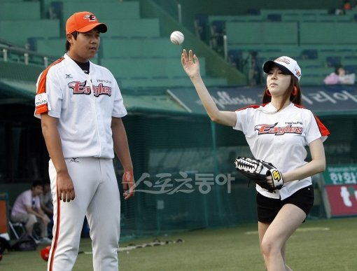 2011 프로야구 한화이글스 대 롯데자이언츠 경기가 4일 대전 한밭야구장에서 열렸다. 경기 전 시구자로 나설 레이싱모델 김나나 양이 한화투수 유창식에서 투구폼을 배우고 있다.