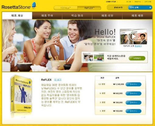 한편 이날 함께 공개된 토털e는 기존의 ‘버전 3(CD 설치형)’를 한층 업그레이드한 제품으로, 하루에 50분간 미국 원어민과 대화를 나눌 수 있으며, 전세계 다른 사용자들과 게임을 즐기며 언어도 배우고 친구도 사귈 수 있는 ‘로제타월드’ 기능이 추가됐다(이는 리플렉스에도 포함된다).
