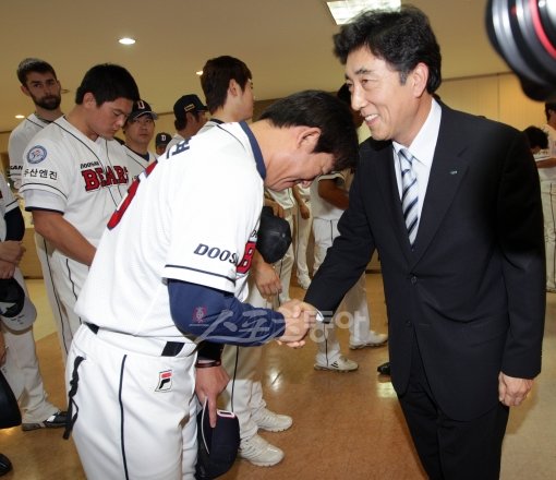 11일 오후 2시 서울 잠실야구장에서 두산 대표이사 이·취임식이 열려 김승영 신임 대표이사가 선수 및 코칭스태프들과 인사를 하고 있다. 신임 김 사장은 1984년 광고대행사 ㈜오리콤에 입사한 뒤 1991년 두산의 전신인 OB 베어스로 자리를 옮겼고, 이후 구단 마케팅과 관리를 담당하다 2004년부터 단장을 맡아왔다.