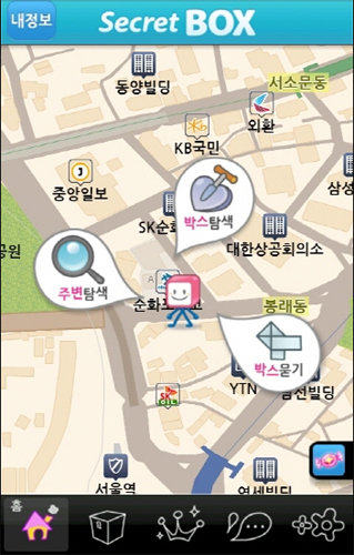 네시삼십삼분은 모바일 이용자의 위치정보를 활용한 소셜네트워크서비스(SNS) 시크릿 박스(Secret Box·사진)를 출시했다고 16일 밝혔다. 시크릿 박스는 다른 사람이 특정 장소에 묻어둔 가상의 상자 속에서 사진과 메시지를 열어 보고 댓글을 남기거나 실시간 대화가 가능한 애플리케이션이다. SK텔레콤 T맵 오픈 API(Application Program Interface)를 적용해 개발됐다. T스토어와 국내 애플 앱스토어에서 무료로 다운 받을 수 있다.