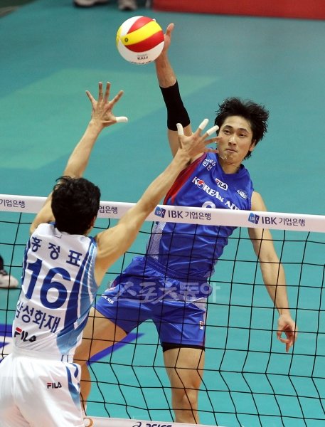 16일 수원 실내체육관에서 열린 2011 수원 IBK기업은행컵 대한항공과 삼성화재의 경기에서 경기에서 대한항공 김학민이 삼성화재 홍정표의 블로킹을 피해 스파이크를 날리고 있다.수원ㅣ박화용 기자 (트위터 @seven7sola) inphoto@donga.com