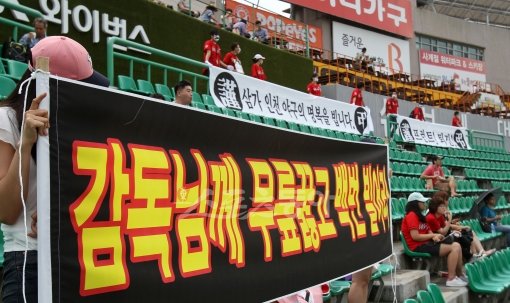 18일 인천 문학야구장에서 열린 프로야구 삼성 라이온즈와 과 SK 와이번스의 경기에서 SK팬들이 김성근 감독 경질에 대해 항의성 플래카드를 들고 침묵 시위를 하고 있다.