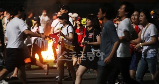 18일 인천 문학야구장에서 프로야구 삼성 라이온즈와 과 SK 와이번스의 경기가 열렸다. SK팬들이 경기 종료 후 김성근 감독 경질에 대해 항의하기 위해 그라운드에 난입하고 있다.