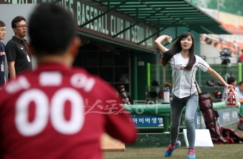 19일 서울 목동구장에서 열린 프로야구 KIA 타이거즈와 넥센 히어로즈의 경기 전에 개그우먼 신보라가 시구 연습을 하고 있다.