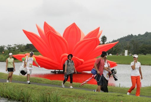 골프대회가 다양한 이벤트를 접목시키면서 진화하고 있다. 골프와 아트를 주제로 개최된 KLPGA 넵스 마스터피스 경기 중 갤러리와 선수들이 연못에 설치된 예술작품을 배경으로 이동하고 있다.