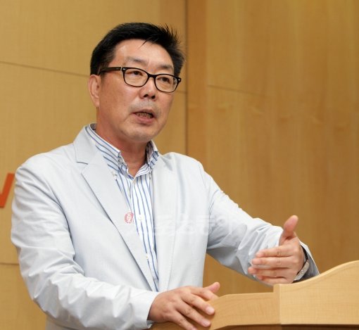 SK 와이번스 신영철 사장이 24일 두산전에 앞서 기자들과 간담회를 가지며 지난 18일 김성근 전 감독 경질과 관련해 입장을 표명하고 있다.