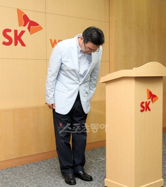 SK 와이번스 신영철 사장이 24일 두산전에 앞서 기자들과 간담회를 가지며 지난 18일 김성근 전 감독 경질과 관련해 입장을 표명한 뒤 머리를 숙이고 있다.