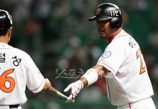 24일 인천 문학야구장에서 열린 ‘2011 롯데카드 프로야구’ SK와 두산의 경기에서 4회말 무사 1루 상황에 이호준이 헛스윙하며 배트를 놓쳐 3루 이철성 코치가 건네주고 있다.