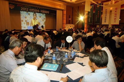 25일 오후 서울 잠실 롯데호텔에서 진행된 2012 프로야구 신인선수 지명회의에서 각구단 관계자들이 서류를 보며 지명권 작전을 논의하고 있다.