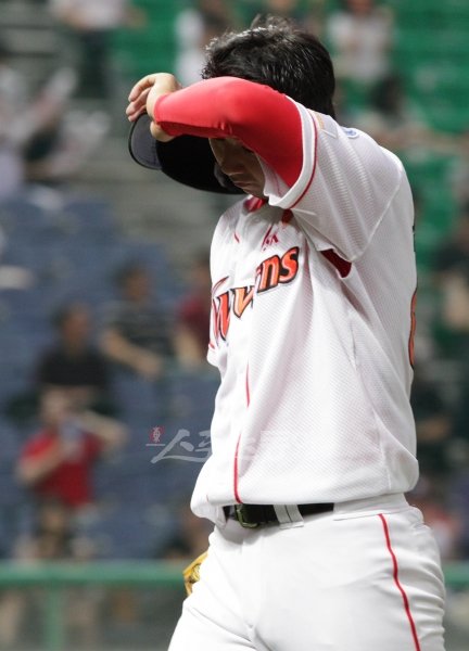 25일 인천 문학야구장에서 열린 ‘2011 롯데카드 프로야구’ SK와 두산의 경기에서 3회초 4실점한 SK 선발 윤희상이 땀을 닦으며 공수교대하고 있다.