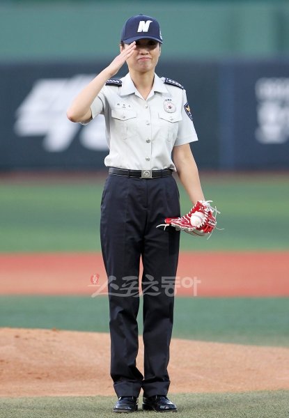 26일 서울 목동야구장에서 열린 ‘2011 롯데카드 프로야구’ 넥센과 롯데의 경기에 앞서 양천경찰서의 날을 맞이해 최정수 경사가 넥센 승리기원 시구를 하고 있다.