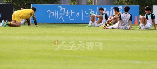 조광래 감독이 이끄는 축구대표팀이 2014브라질월드컵 아시아지역 3차예선 레바논(9월2일)과 쿠웨이트(9월6일)전에 대비해 28일 파주NFC(대표팀트레이닝센터)에서 소집훈련에 나섰다. 선수들이 가볍게 몸을 풀며 휴식을 취하고 있다.