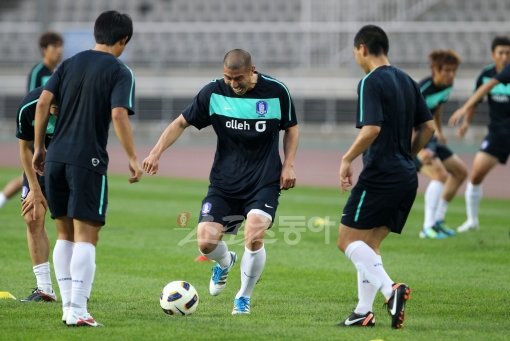 조광래 감독이 이끄는 축구대표팀이 2014 브라질월드컵 예선전을 하루 앞둔 1일 오후 고양종합운동장에서 소집훈련을 가졌다. 차두리가 조를 이뤄 동료들과 연습을 하고 있다.